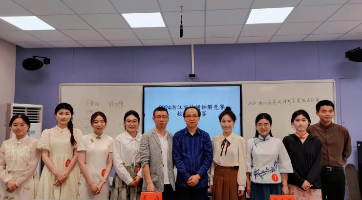 前期:今年3月,学院正式启动备赛选拔工作,先后组织二级学院选拔、校赛、省赛推荐等环节。在集训过程中,指导教师从经典诗词朗诵、经典诗词解析、讲解稿撰写、讲解表达技巧、讲解PPT制作、讲解视频剪辑等方面对选手进行培训。5月19日晚,通过线上视频评审胜出的12位选手经过专家评委现场评审,王欣楠、黄泺璋、施桦、陈苏敏、潘贞含、方智懿、金舒妍、袁靖怡等8位同学获得省赛资格,代表我校参加浙江省第十二届大学生中华经典诵写讲大赛“诗泽之江”诗词讲解大赛初赛。