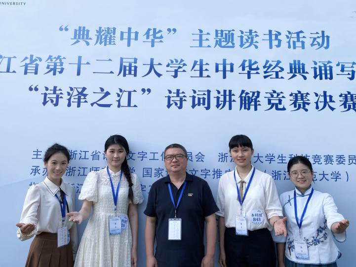 中期:6月,王欣楠、方智懿、金舒妍、袁靖怡获得省赛三等奖,陈苏敏、黄泺璋、施桦、潘贞含入围省决赛。今年省决赛提前至七月份举办,本次备赛时间紧任务重。suncitygroup太阳集团金妮娅、程向荣、王欣三位指导教师组织参赛选手进行为期一周的集中强化训练,严格按照省赛模式,对“诗词知识”“诗词讲解”“现场问答”三个环节展开全真模拟训练。7月6日,浙江省第十二届大学生中华经典诵写讲大赛“诗泽之江”诗词讲解大赛决赛在浙江师范大学举行。suncitygroup太阳集团黄泺璋、施桦、陈苏敏均荣获本科组一等奖并获得国赛资格,教师教育学院(体育学院)潘贞含荣获本科组二等奖。